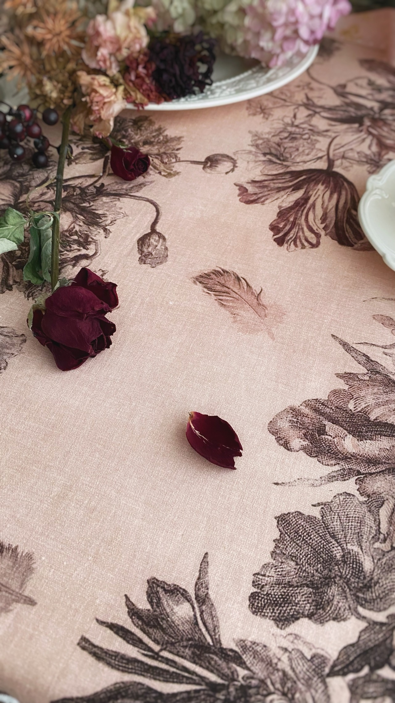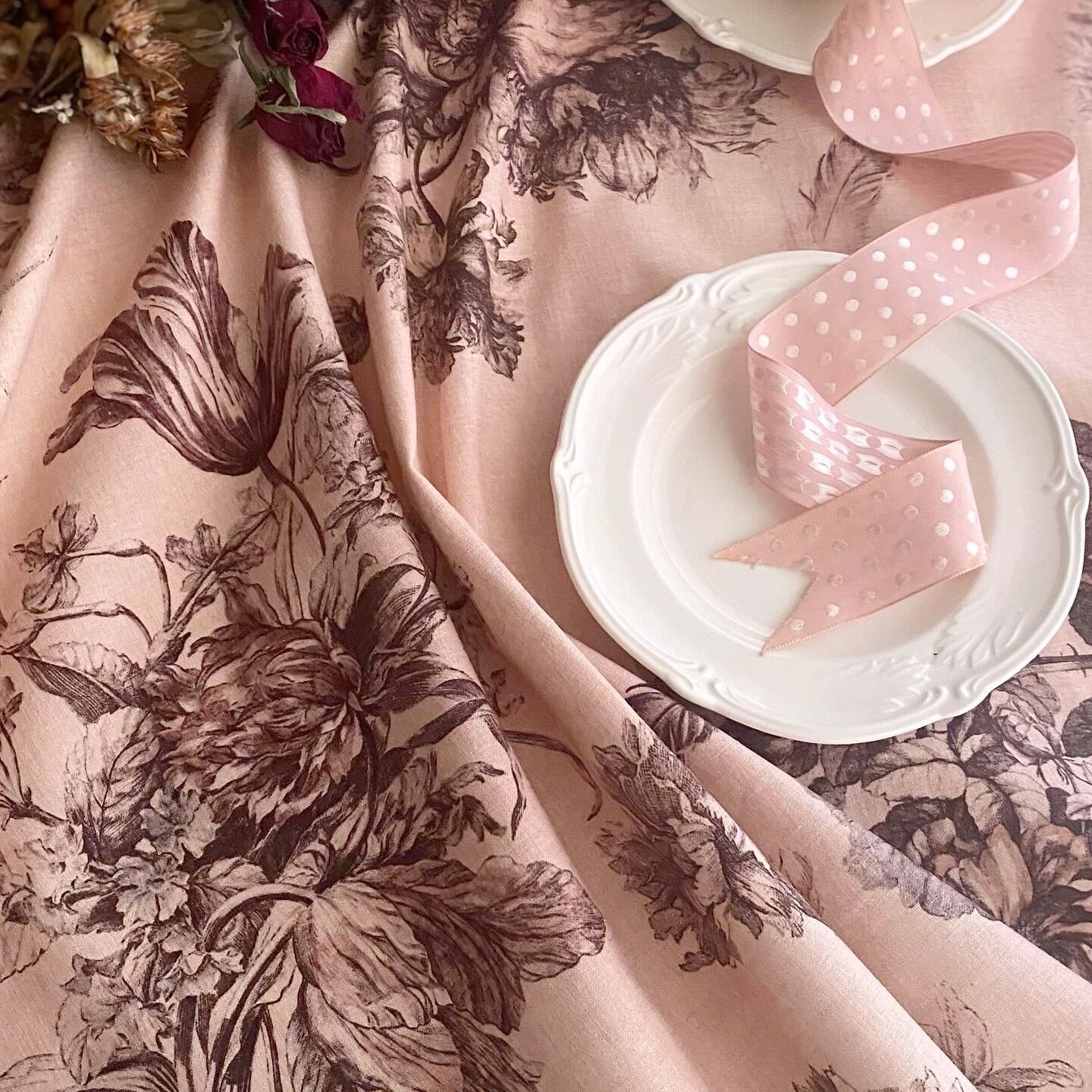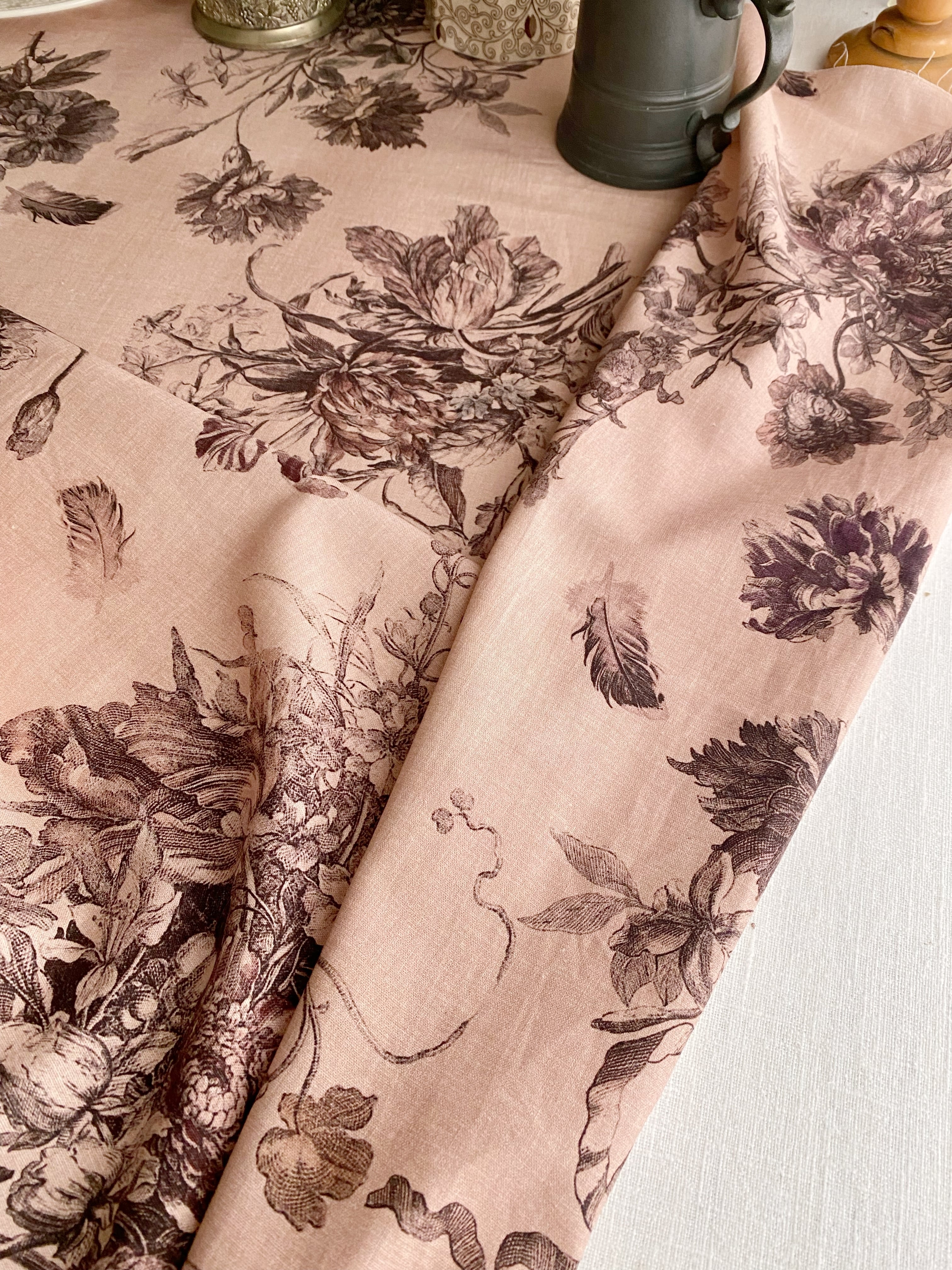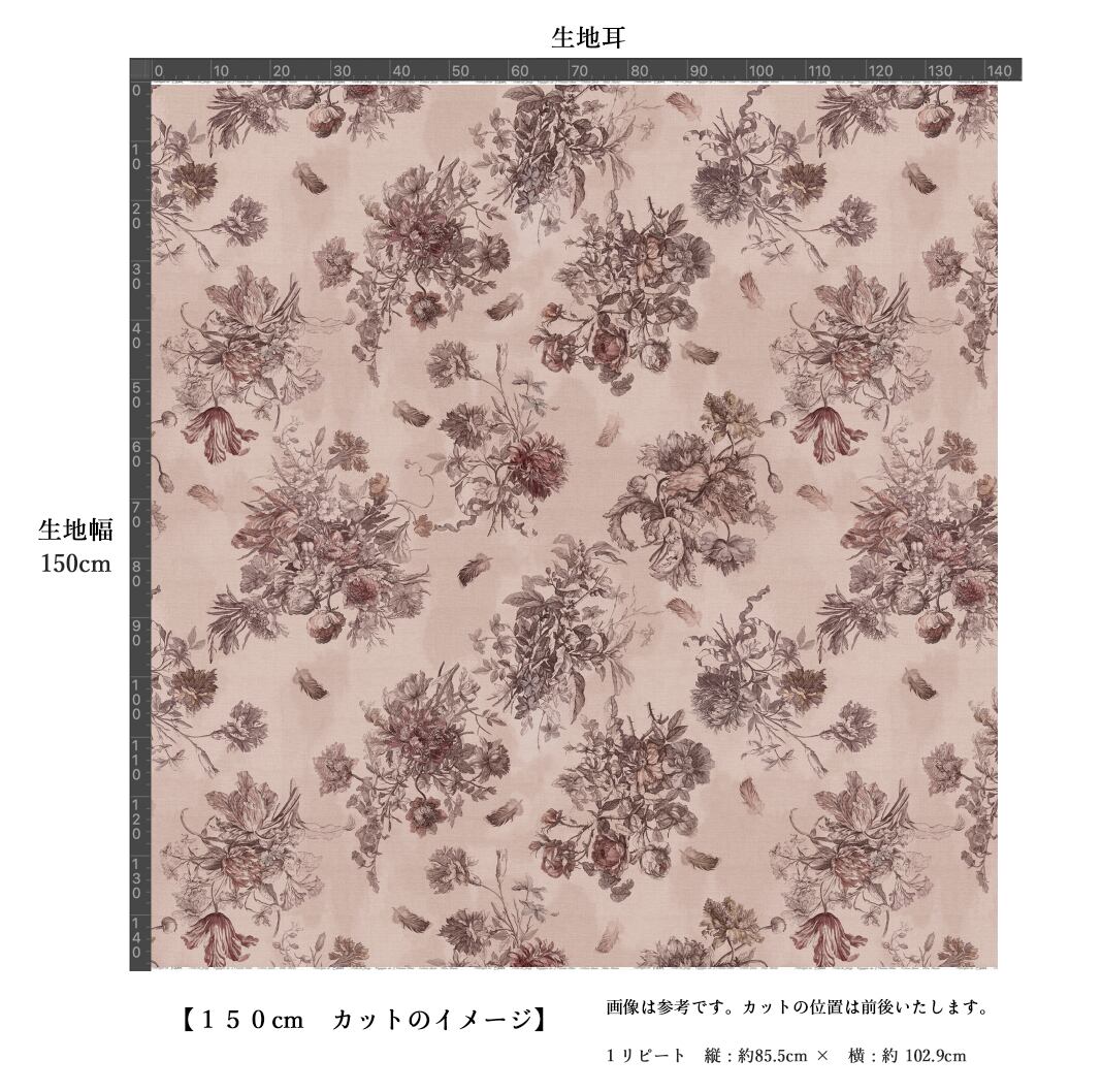 Antique Rose アンティーク ローズ『花束と羽根』柄 コットンリネン【1m=数量2 より購入可】50cmにつき¥6850