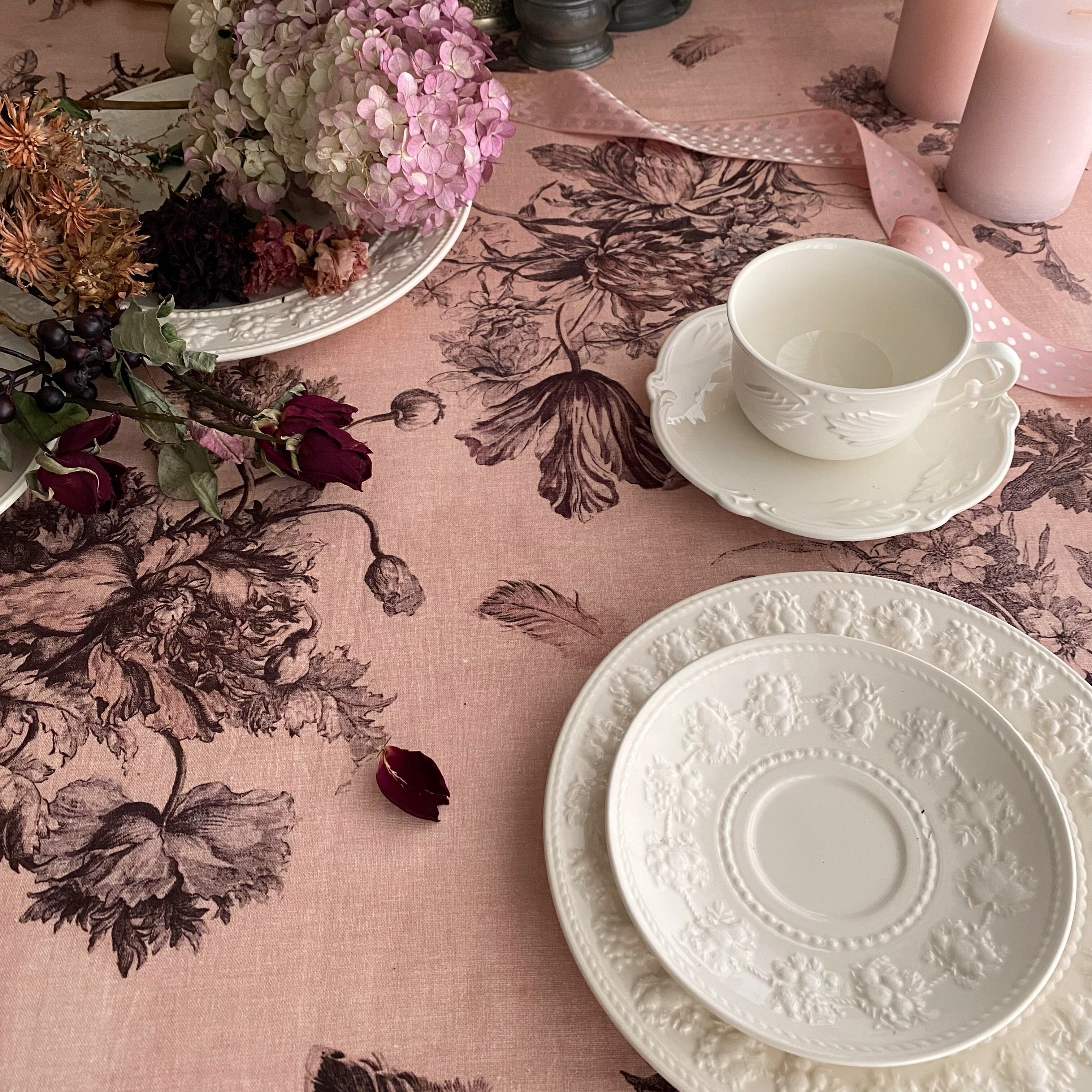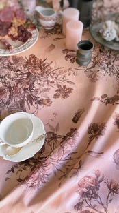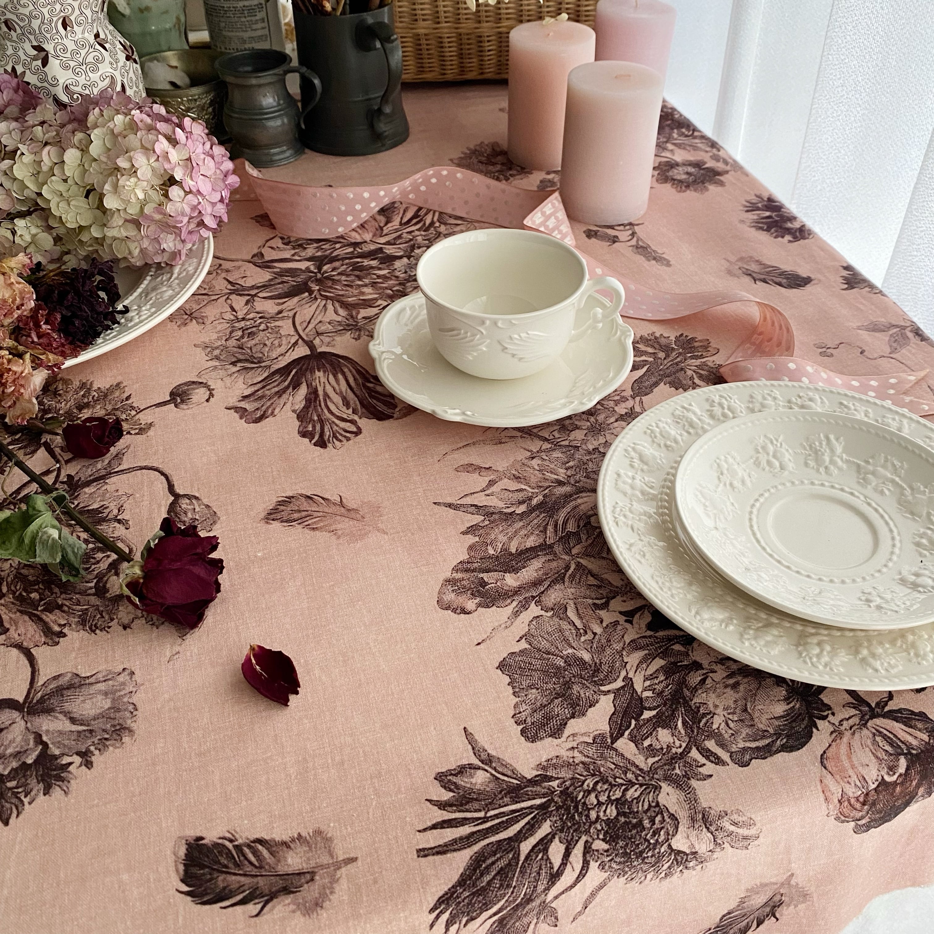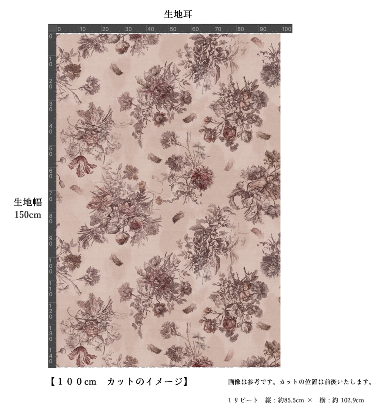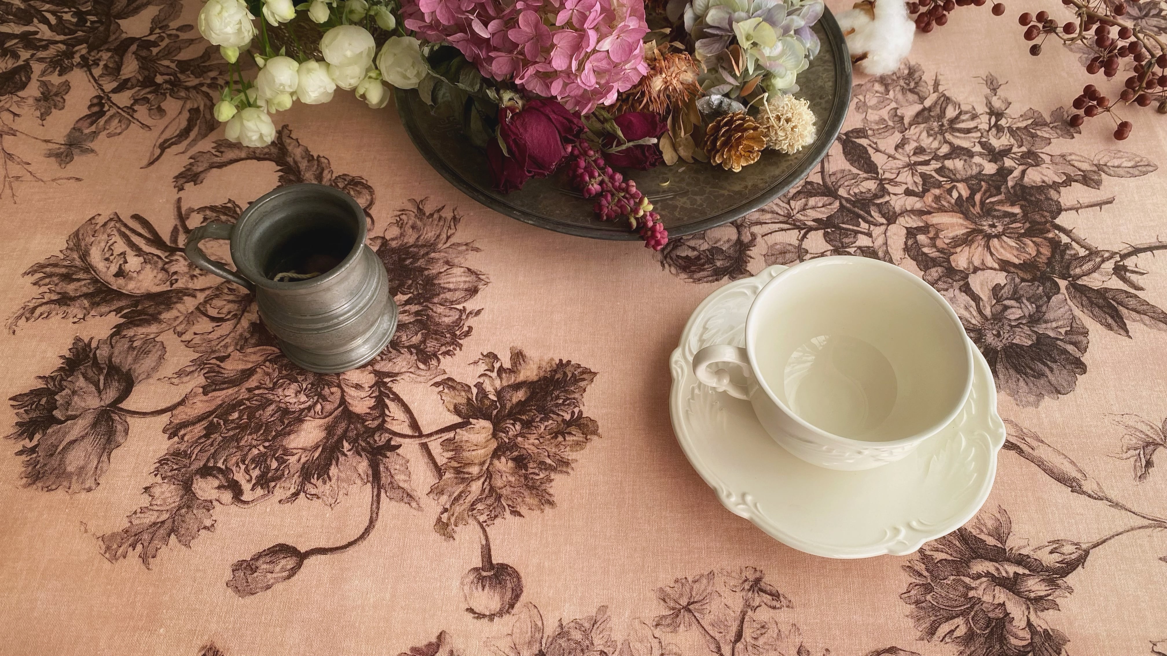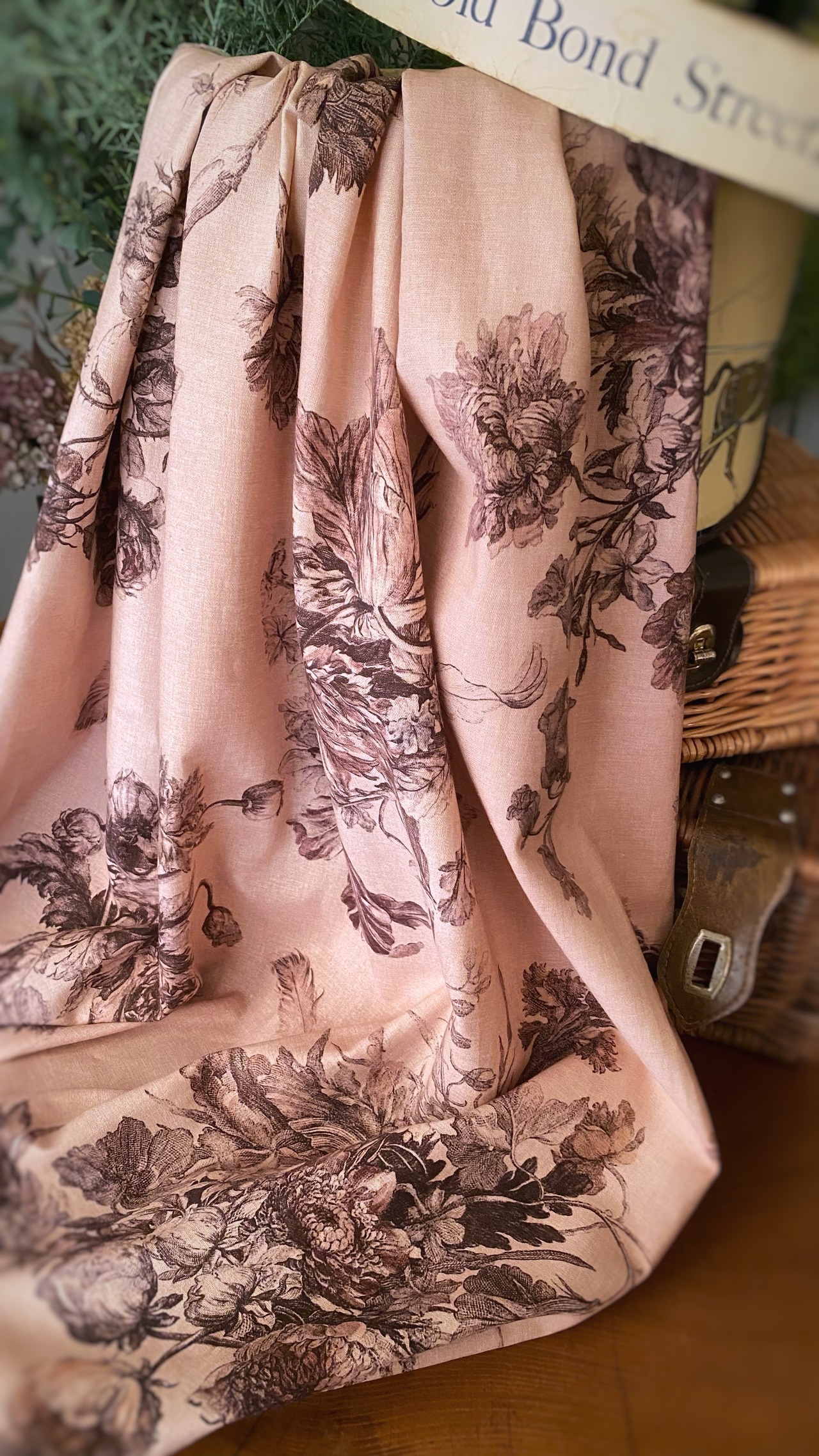 Antique Rose アンティーク ローズ『花束と羽根』柄 コットンリネン【1m=数量2 より購入可】50cmにつき¥6850