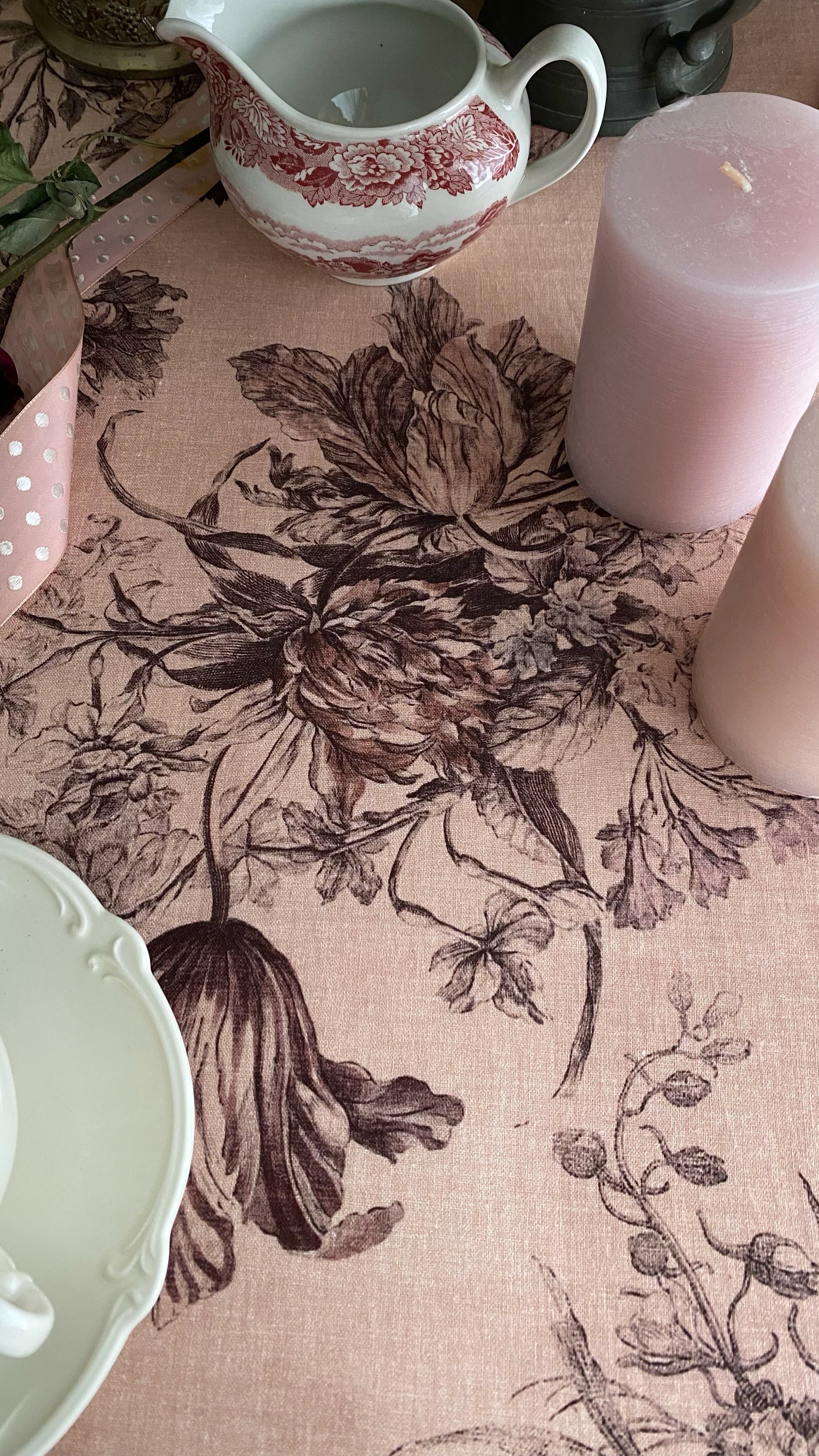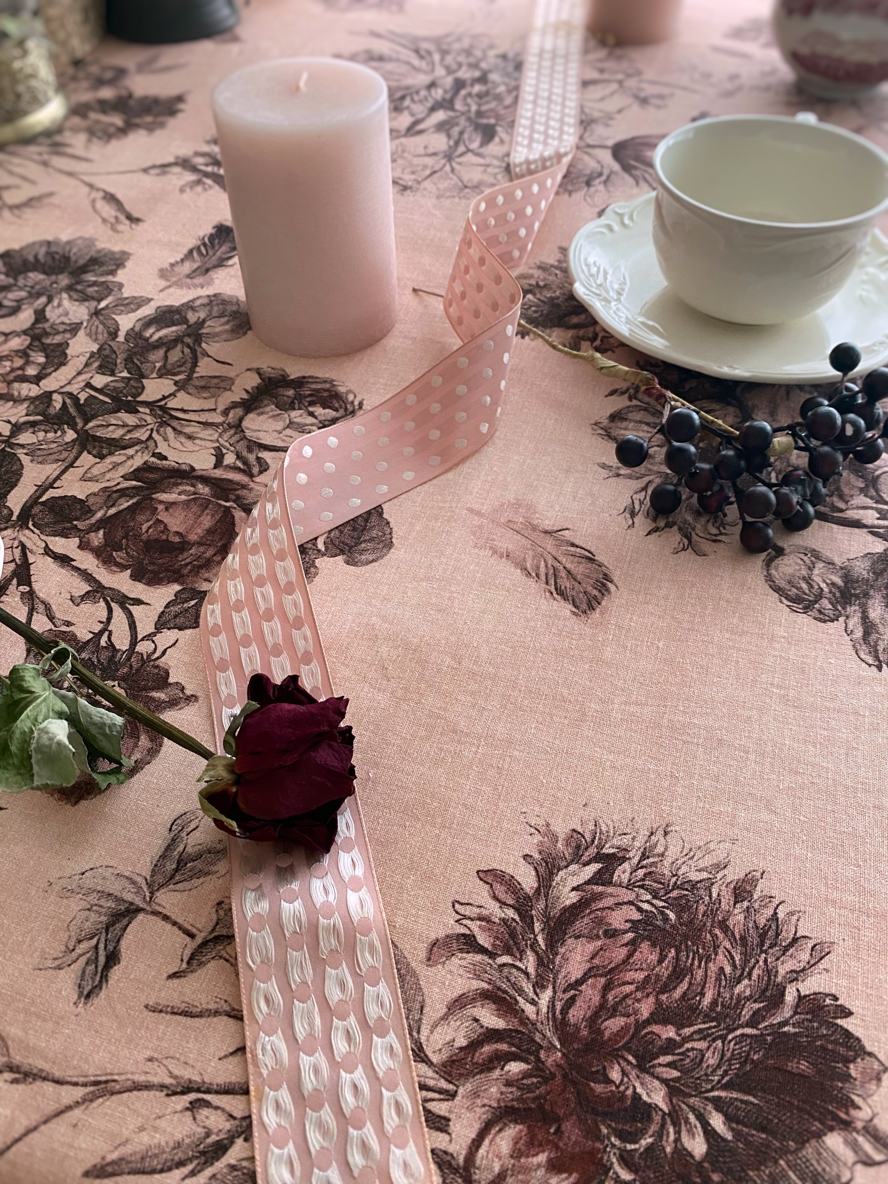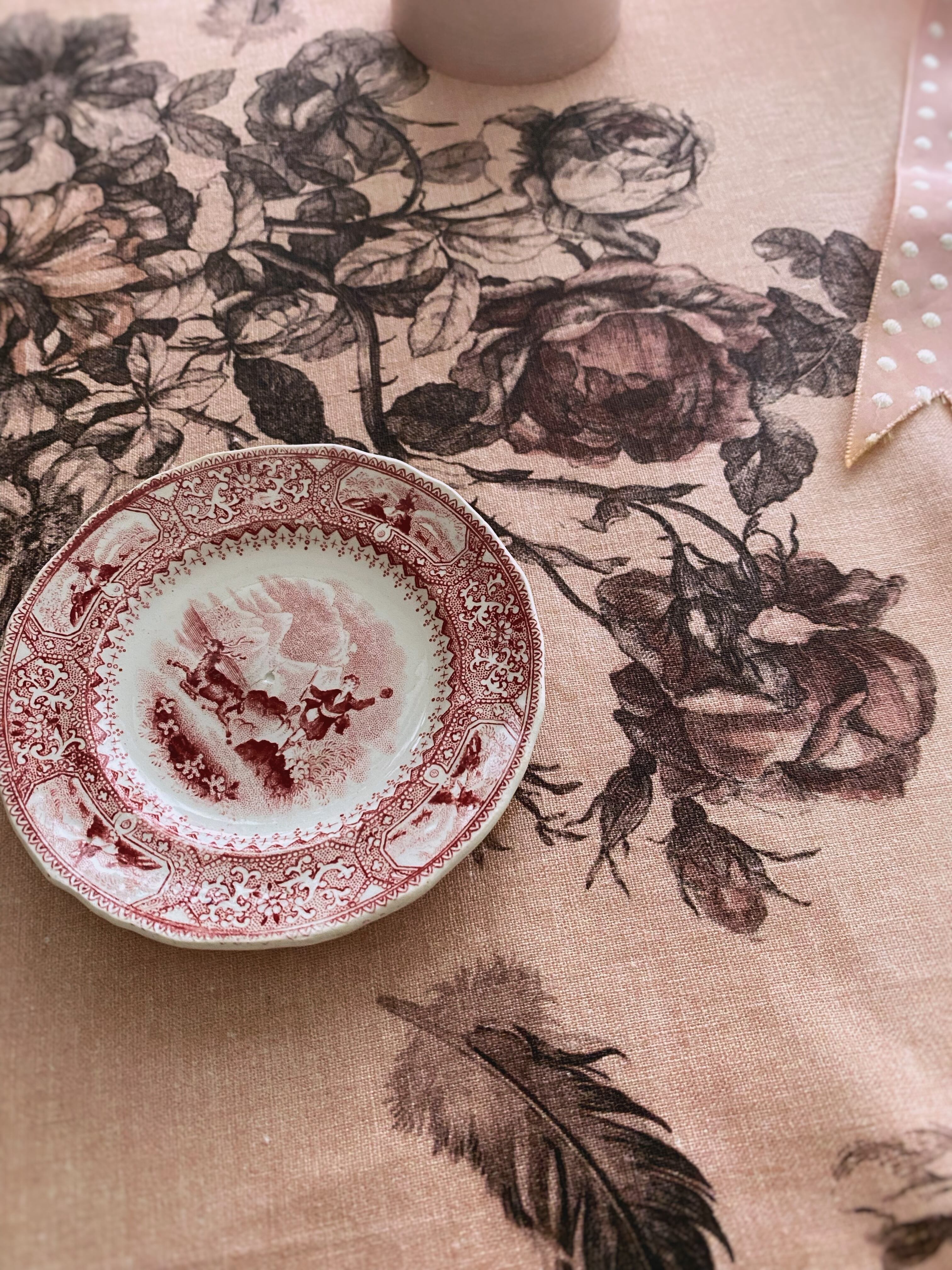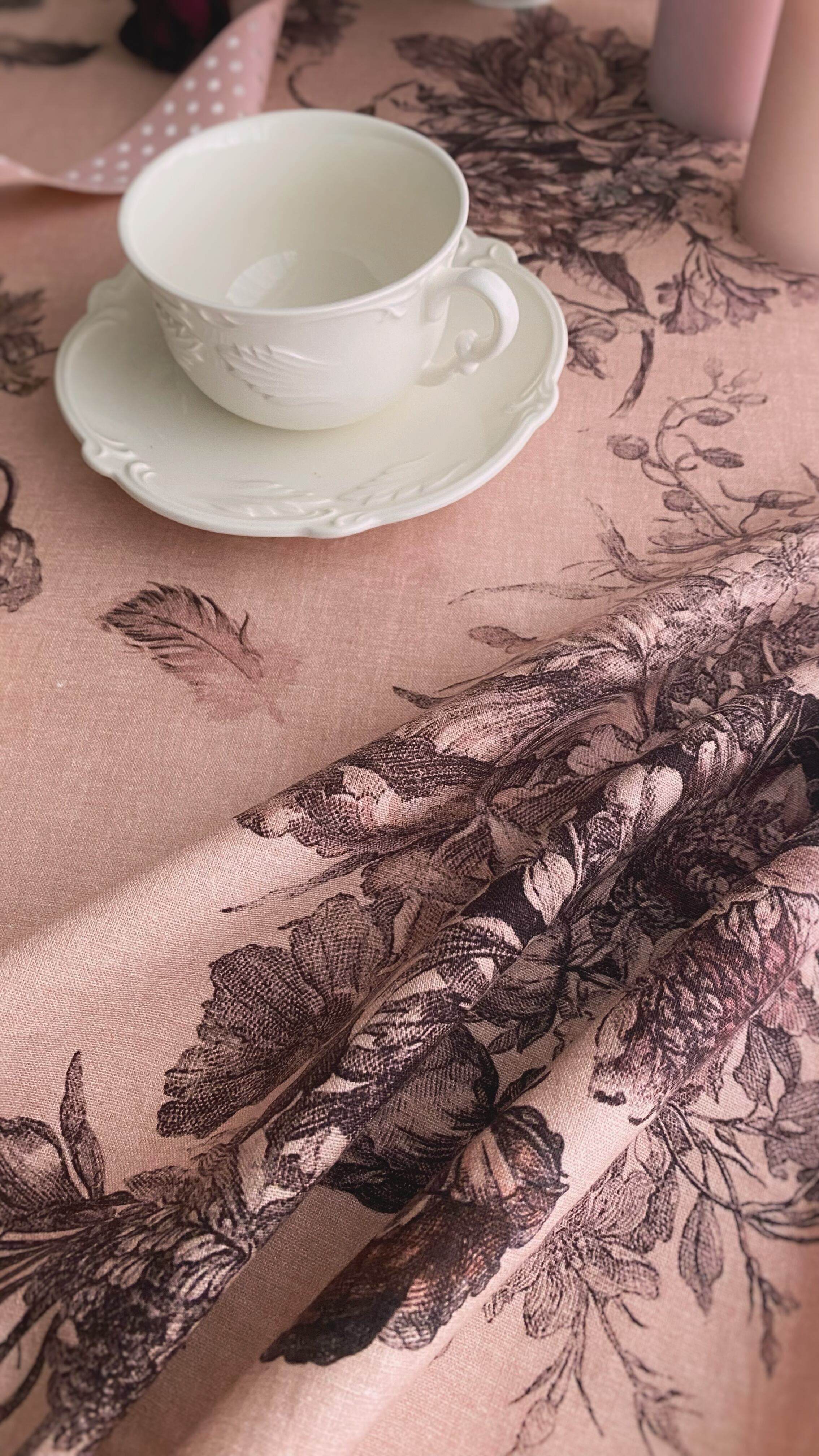 Antique Rose アンティーク ローズ『花束と羽根』柄 コットンリネン【1m=数量2 より購入可】50cmにつき¥6850