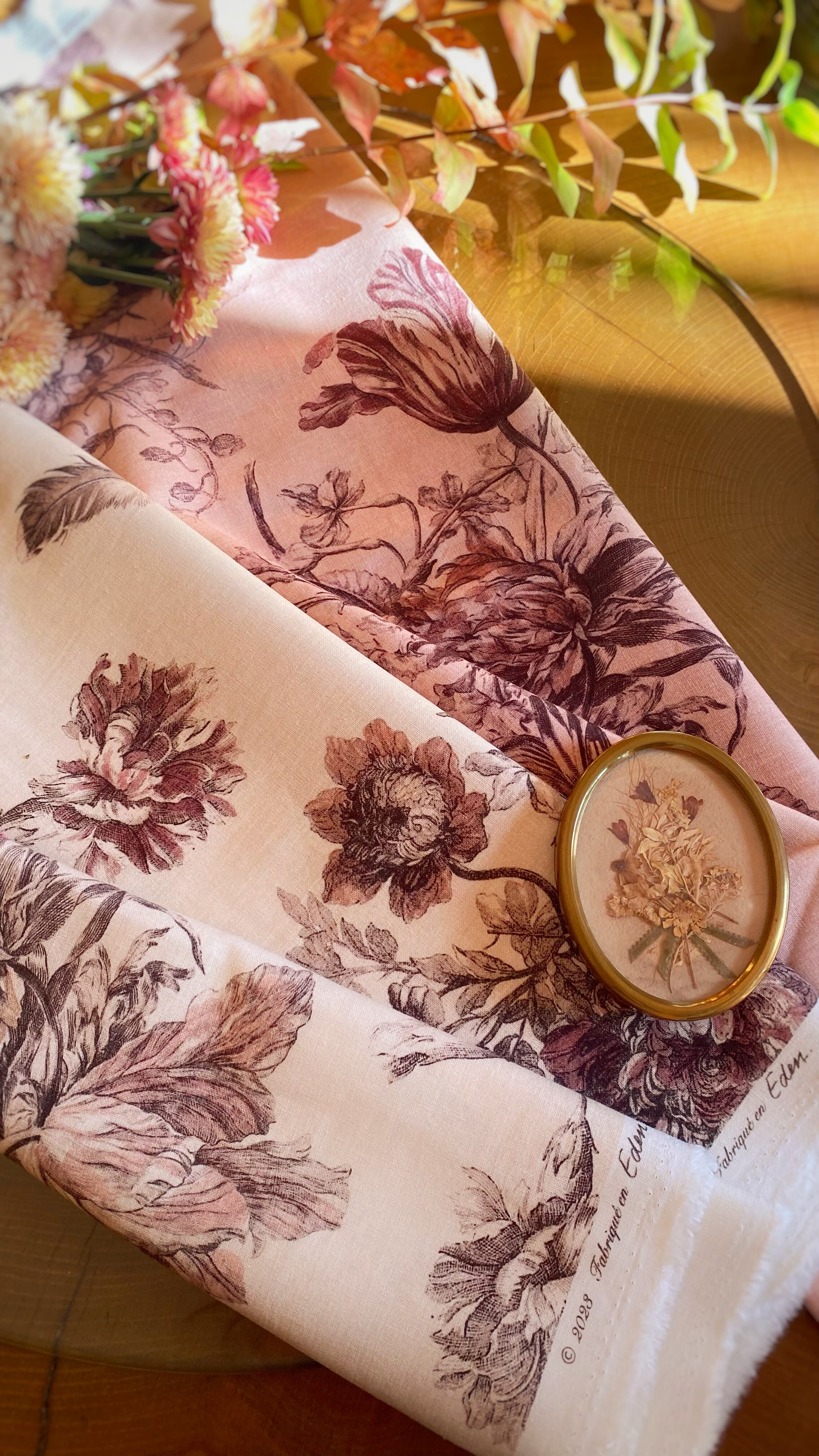 フレンチアンティークの布の魅力を再現しながら『Eden』の世界観を込めたこの布は、テーブルまわりやその他インテリアに、1箇所あるだけで空間に爽やかな高級感を演出します。