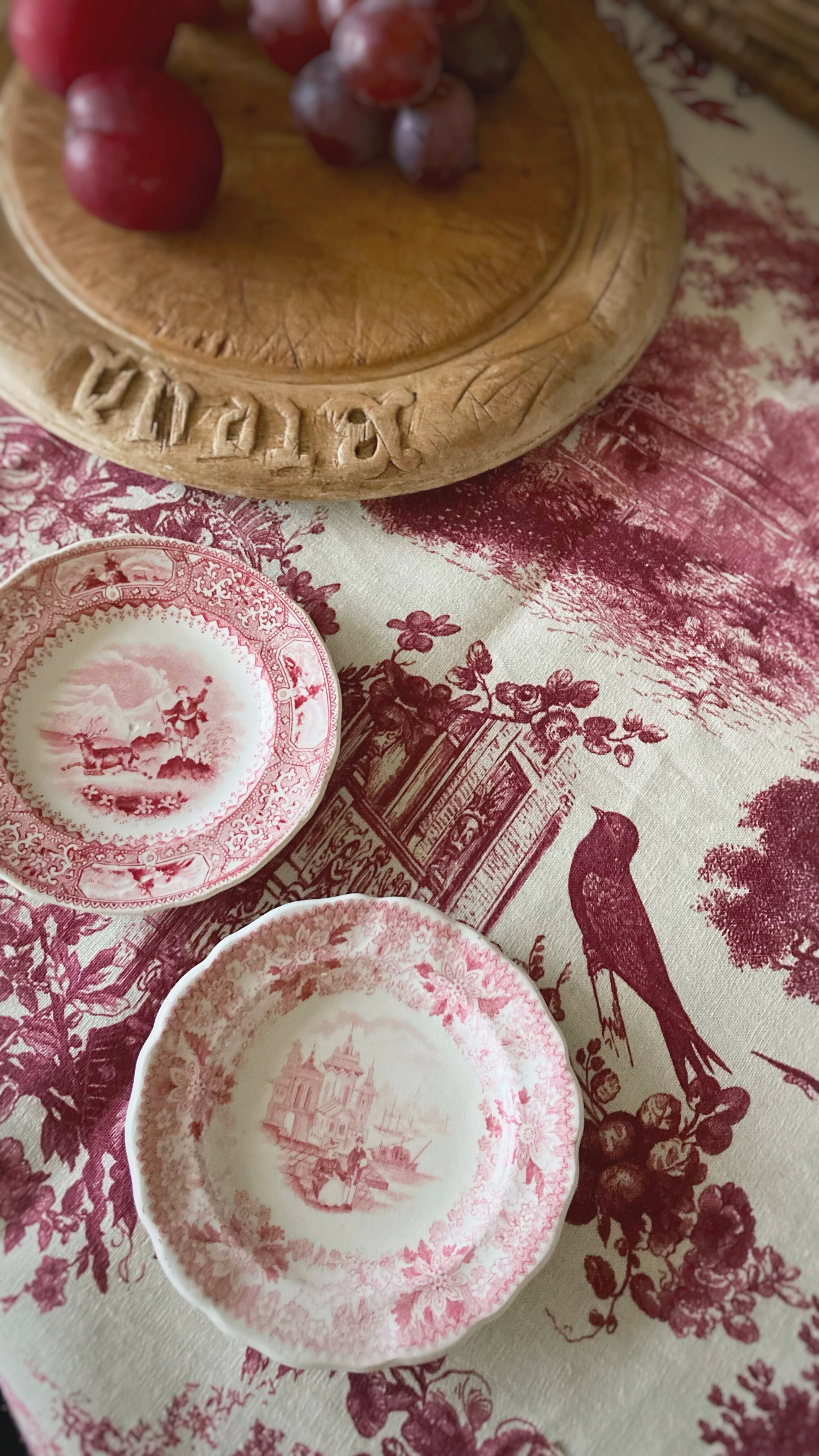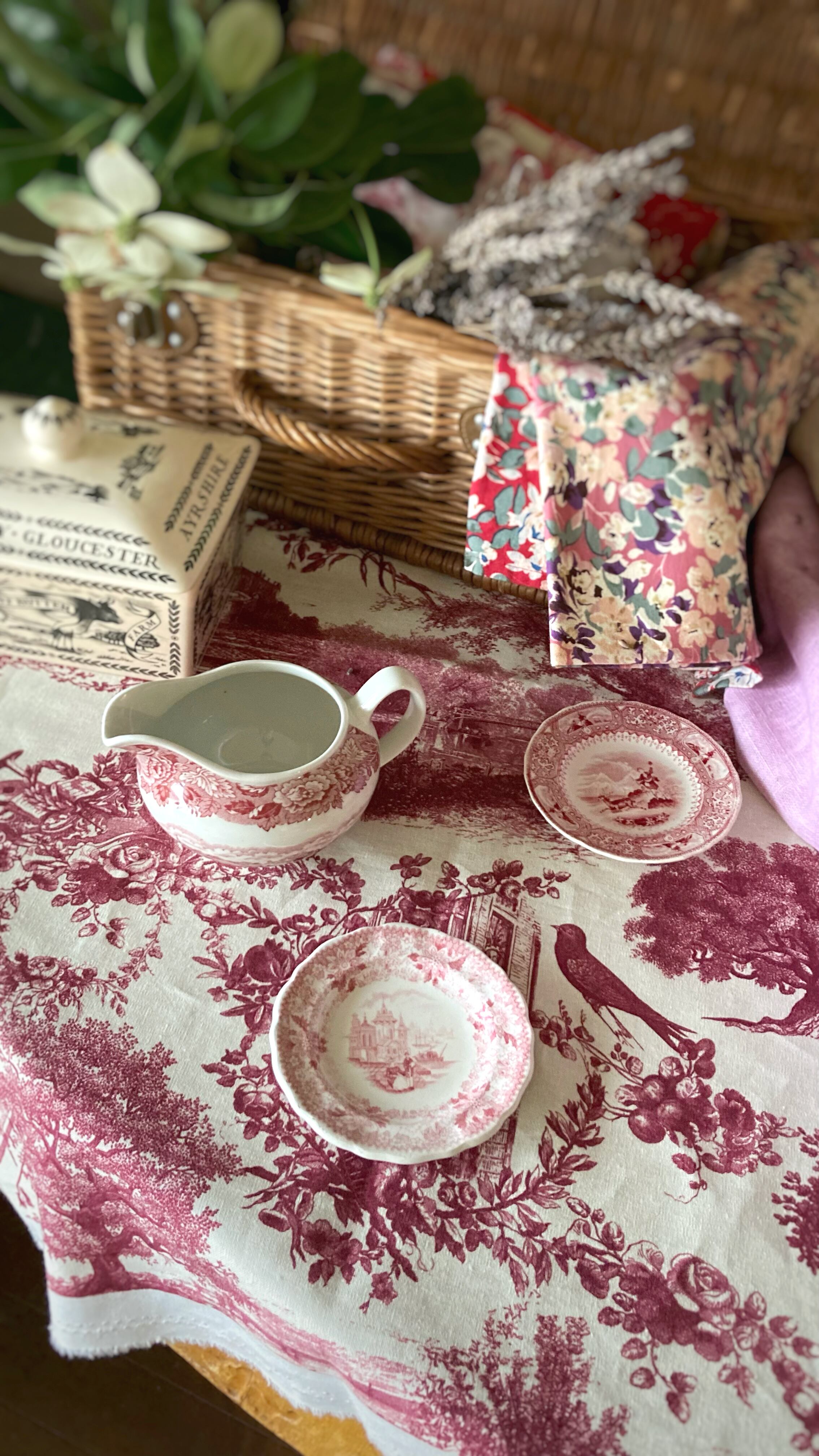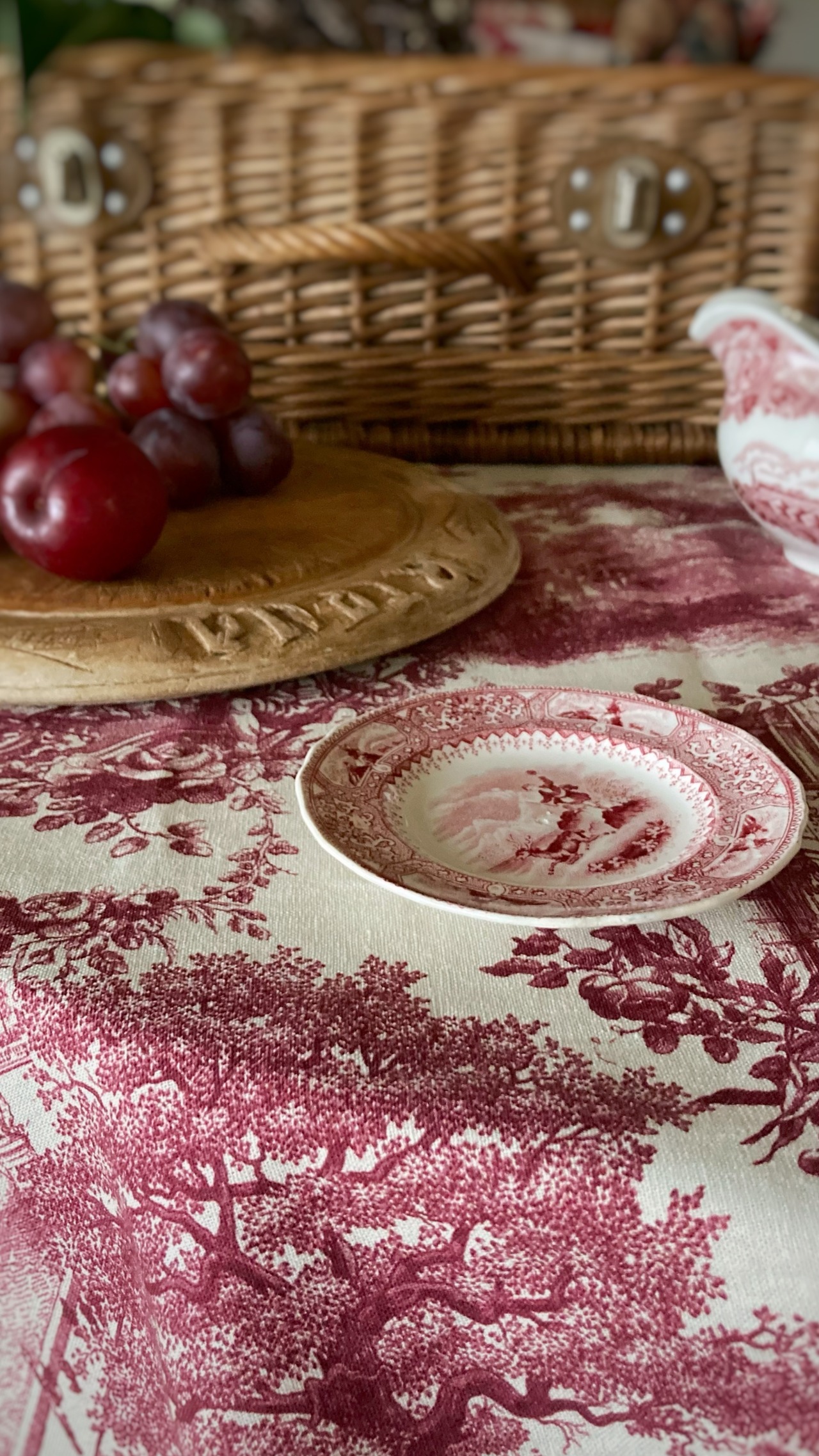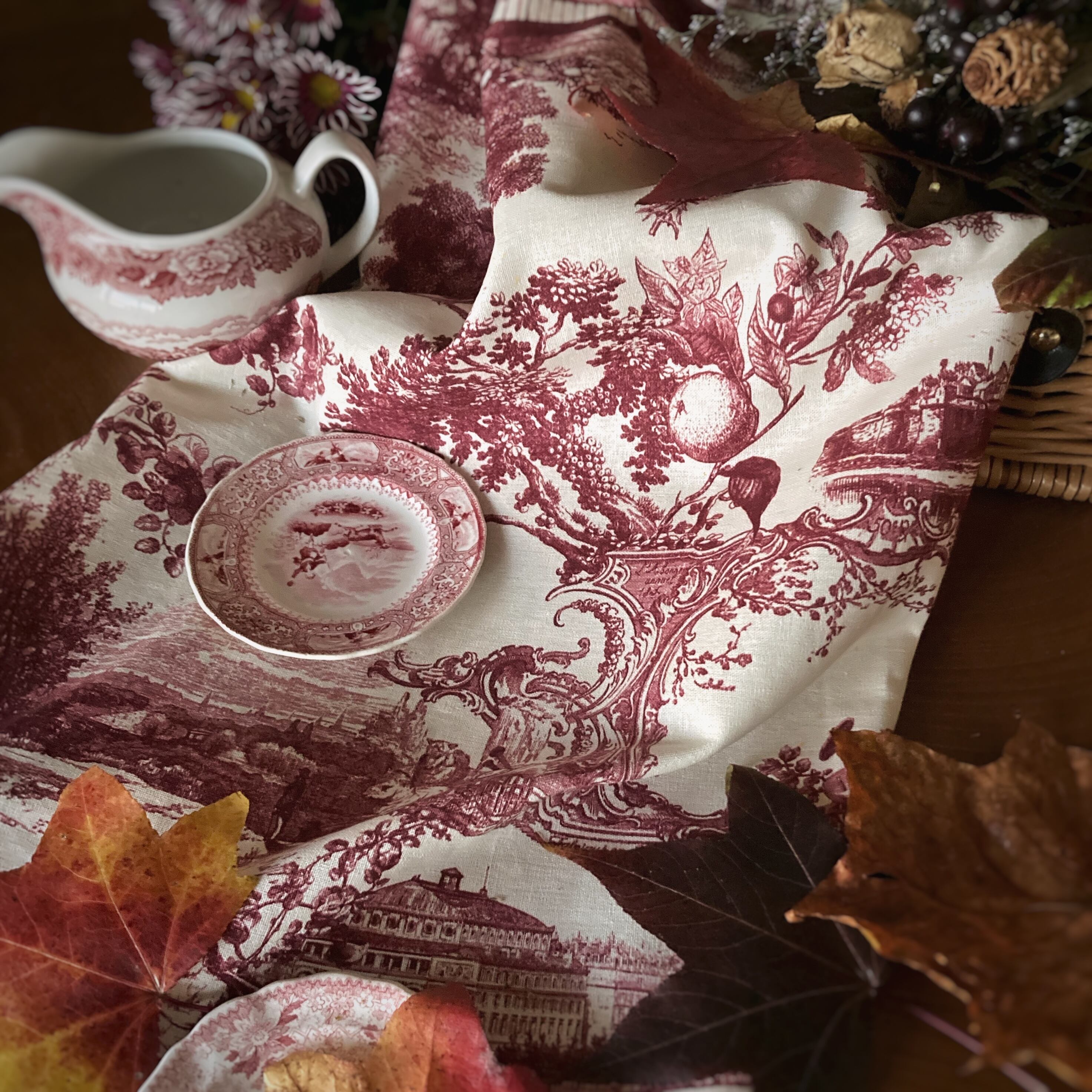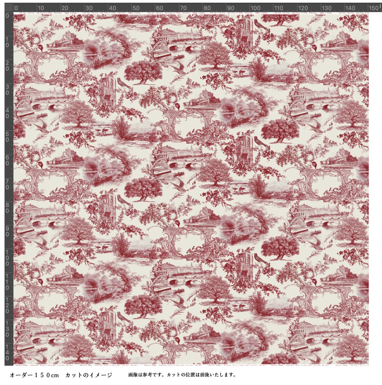 フランスやイギリスで見た古いアンティークファブリックによく見られるナチュラルなベージュ生地色に載った、深い赤色に想いを込めて再現しました。