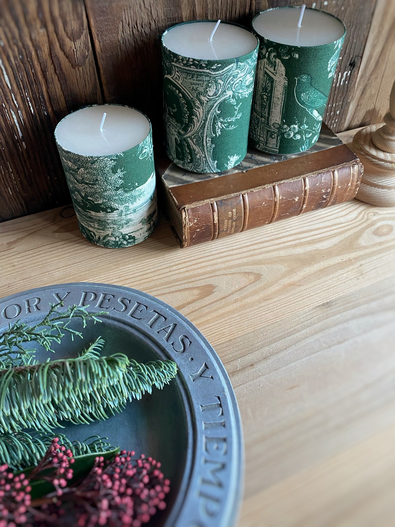 緑のキャンドルによる 3点セットの一点ものアートオブジェ です。